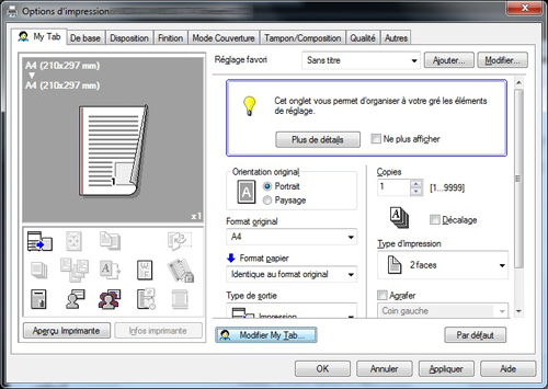 Lorsque vous utilisez une combinaison de réglages d'impression souvent utilisés, vous pouvez appliquer facilement la totalité de ces réglages juste en sélectionnant la combinaison la liste des Réglages favoris, même si la combinaison est complexe et contient plusieurs onglets.