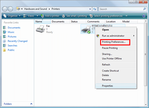 Sous Windows XP/Vista/Serveur 2003/Serveur 2008, faites un clic droit sur l'icône de l'imprimante installée, et cliquez sur [Préférences d'impression...].
