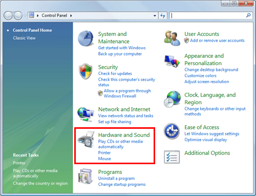 Sous Windows Vista/Server 2008, cliquez sur le menu Démarrer et sélectionnez [Panneau de configuration] - [Matériel et son] - [Imprimante].