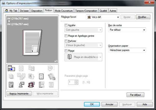 Dans l'onglet [Finition], vous pouvez configurer les réglages de finition des feuilles imprimées.