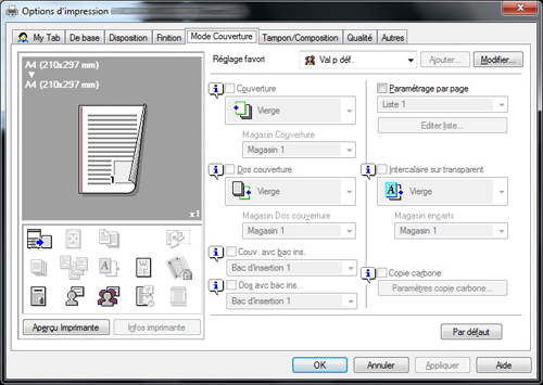 [Couverture] | Cochez cette case pour insérer et imprimer une couverture recto. Dans [Magasin Couverture], sélectionnez le magasin papier pour la couverture. Puis sélectionnez s'il faut imprimer sur la page de couverture.
