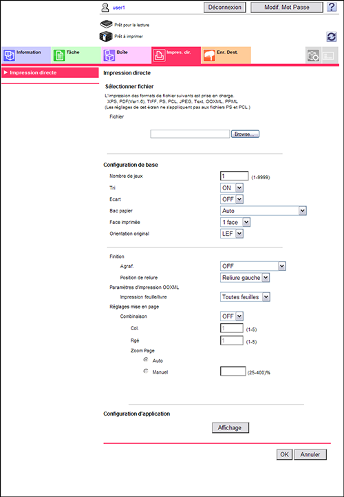 La fonction Impression directe vous permet d'envoyer directement des fichiers PDF (Ver.1.6), JPEG, TIFF, XPS, PS, PCL, Texte, OOOXML (.docx/.xlsx/.pptx) et PPML (.ppml/.vdx/.zip) de votre ordinateur à la machine pour les imprimer sans utiliser le pilote d'imprimante.