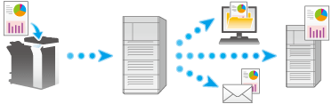 Cette machine convertit les données numérisées de l'original en un format de fichier compatible avec un ordinateur et les envoie à un serveur de numérisation. Lors de la réception du fichier, le serveur de numérisation procède à l'envoi vers le dossier SMB, une adresse e-mail ou le serveur SharePoint Microsoft Office sur la base de la procédure de numérisation enregistrée.
