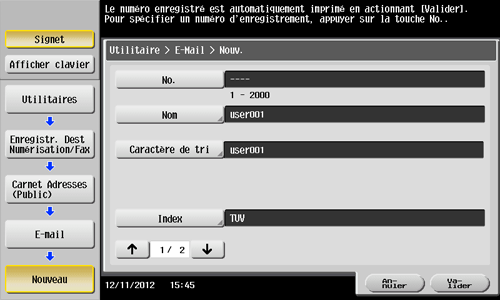 Tapez sur [Utilitaire] - [Enregistrement 1-Touche/Boîte] - [Enregistr. Dest Numérisation/Fax] - [Carnet Adresses (Public)] - [E‑mail] - [Nouveau].