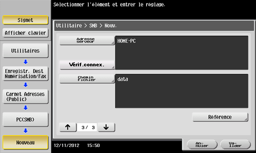Tapez sur [Utilitaire] - [Enregistrement 1-Touche/Boîte] - [Enregistr. Dest Numérisation/Fax] - [Carnet Adresses (Public)] - [PC(SMB)] - [Nouveau].