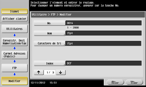 Tapez sur [Utilitaire] - [Enregistrement 1-Touche/Boîte] - [Enregistr. Dest Numérisation/Fax] - [Carnet Adresses (Public)] - [FTP] - [Nouveau].