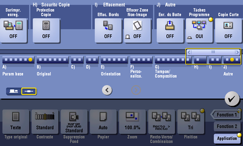 Les originaux sont numérisés avec différents réglages pour chaque jeu et copiés de manière globale. Utilisez cette fonction lorsque plusieurs types d'originaux sont mélangés, par exemple un original recto à imprimer sur une face et un original R/V à copier en l'agrandissant. Une fois que tous les originaux ont été numérisés, vous pouvez ajouter des numéros de page ou des fonctions de finition, telles que le tri, pour les copier.