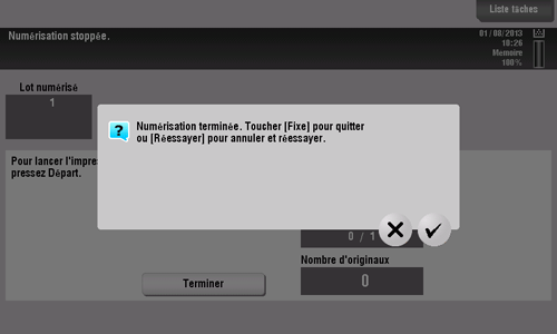 Une fois que tous les originaux ont été numérisés, tapez sur [Finition] et appuyez sur la touche Départ.