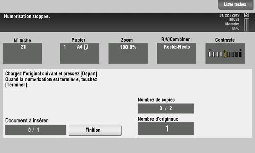 Une fois que l'original à insérer a été numérisé, tapez sur [Finition] et appuyez sur la touche Départ.