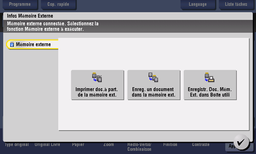Lorsque vous insérez une clé USB dans le port USB de la machine, l'écran [Infos Mémoire Externe] apparaît pour définir une opération de mémoire USB. Vous pouvez utiliser la mémoire USB directement sans sélectionner le mode d'opération Boîte et sans taper sur les boutons [Système] - [Mémoire externe].