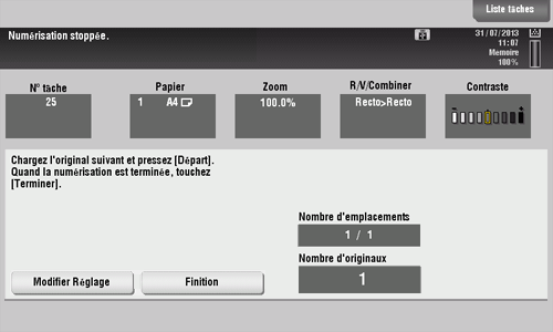 Une fois que tous les originaux ont été numérisés, tapez sur [Finition] et appuyez sur la touche Départ.
