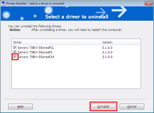 Sélectionnez le pilote de fax à supprimer, puis cliquez sur [Désinstaller].