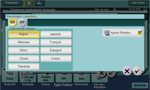 [Sélectionner langue] | Sélectionnez une langue pour le traitement ROC. Sélectionnez la langue utilisée dans l'original pour reconnaître correctement les données de texte. | |