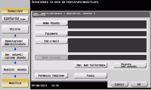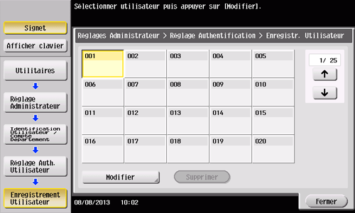 Tapez sur [Utilitaire] - [Réglages Administrateur] - [Identification Utilisateur/Compte Département] - [Réglage Auth. Utilisateur] - [Enregistrement Utilisateur].