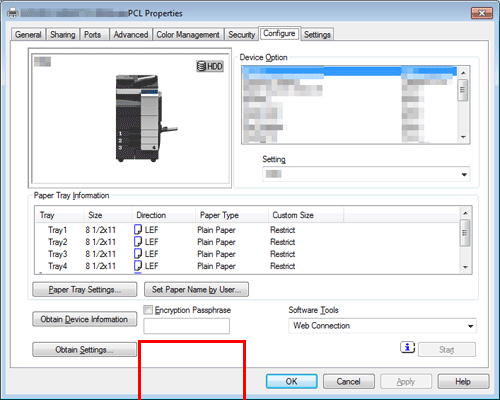 • Wenn die OpenAPI-Kommunikation per SSL verschlüsselt ist und die Geräteinformationen automatisch vom Druckertreiber abgefragt werden können, kann das Verschlüsselungskennwort von diesem System abgerufen werden. Ausführliche Informationen zur Verschlüsselung der OpenAPI-Kommunikation per SSL finden Sie Hier.