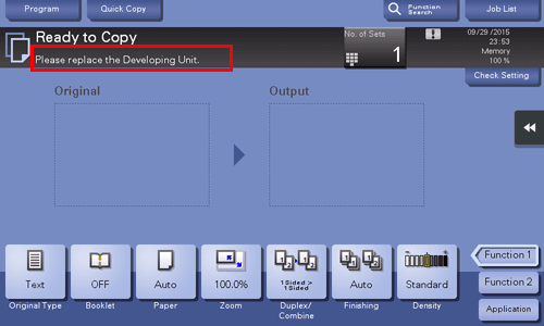 Es müssen Einstellungen vom Servicetechniker vorgenommen werden, um die Meldung im Hinblick auf die Entwicklereinheit anzuzeigen. Weitere Informationen erhalten Sie von Ihrem Kundendienst.