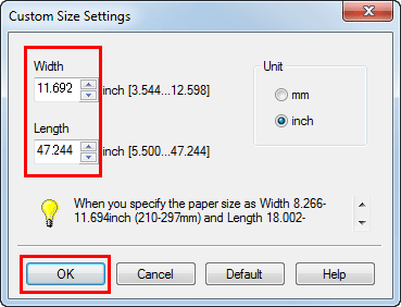 Geben Sie in [Breite] und [Länge] die Breite und die Länge des zu bedruckenden Papiers ein und klicken Sie dann auf [OK].