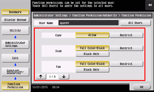 Tippen Sie auf [Funktion zulassen/Berechtigung] - [Funktion zulassen], um Begrenzungen für die einzelnen Funktionen festzulegen.