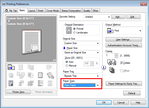 Wählen Sie unter [Originalformat] oder [Papierformat] auf der Registerkarte [Basis] die Option [Benutzerdefiniertes Format].