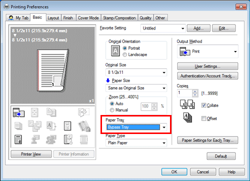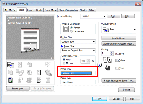 Geben Sie im Druckbildschirm das Fach an, in dem Papier in einem benutzerdefinierten Format eingelegt ist; dadurch haben Sie die Möglichkeit, auf Papier in einem benutzerdefinierten Format zu drucken.