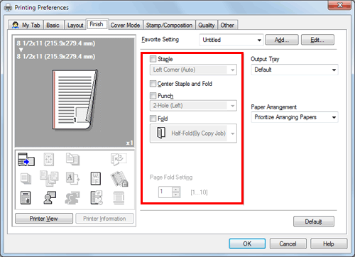 Aktivieren Sie auf der Registerkarte [Finishing] das Kontrollkästchen für die gewünschte Art der Ausgabe. Wenn Sie das Kontrollkästchen [Heften], [Lochen] oder [Falzen] aktiviert haben, geben Sie die Anzahl, die Positionen und die anderen erforderlichen Einstellungen an.