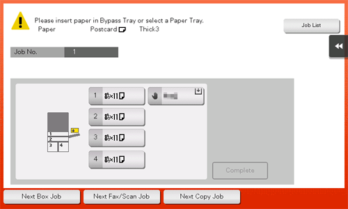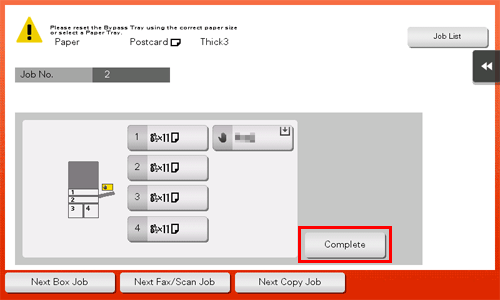 Wenn Sie nicht auf [Fertig] tippen können, überprüfen Sie, ob die Papiereinstellung des Druckertreibers mit der Einstellung des Hauptsystems übereinstimmt. Entfernen Sie außerdem Umschläge oder Postkarten aus der Stapelanlage/dem Spezialeinzug und legen Sie sie wieder ein.