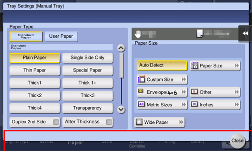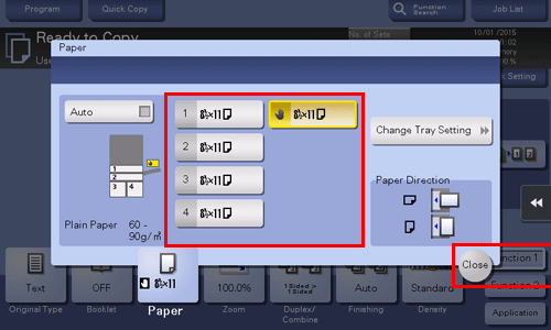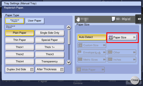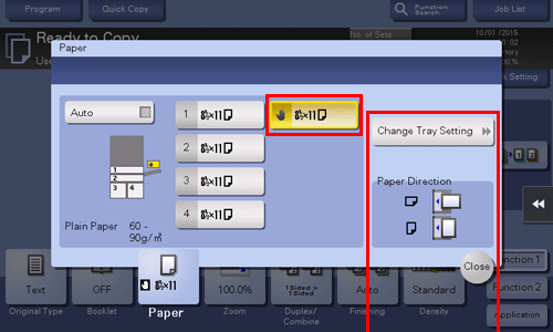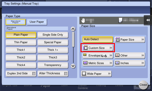 Geben Sie im Papierbildschirm des Kopiermodus das Fach an, in dem Papier in einem benutzerdefinierten Format eingelegt ist; dadurch haben Sie die Möglichkeit, auf Papier in einem benutzerdefinierten Format zu drucken.