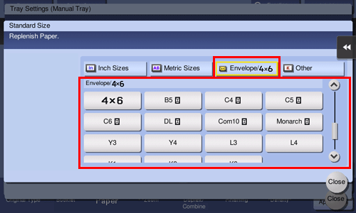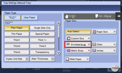 Es stehen verschiedene Umschlagformate zur Verfügung. Geben Sie das korrekte Papierformat für die eingelegten Umschläge an. Wenn die Umschlaggröße angegeben wurde, wird Papiertyp automatisch auf [Umschlag] eingestellt.