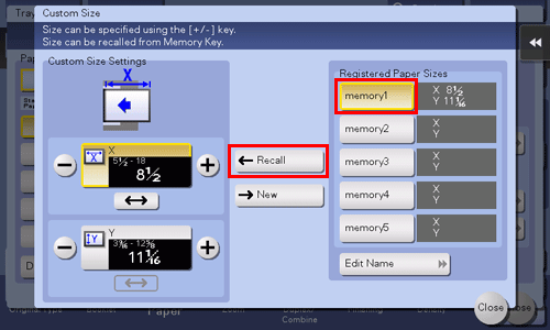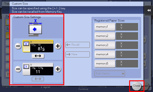 Geben Sie in [Einstellungen f. benutzerdef. Format] das Papierformat an, indem Sie Werte für die Länge und die Breite in [X] und [Y] eingeben. Tippen Sie dann auf [Schließen].