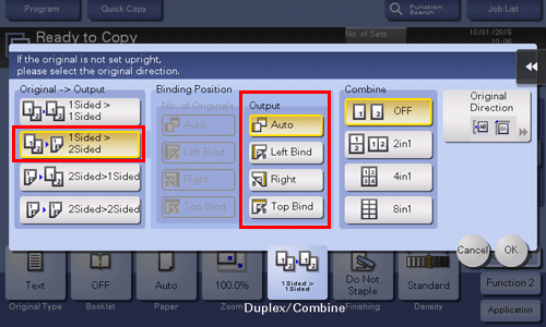 Wählen Sie unter [Original -> Ausgabe ]die Option [1-seitig>2-seitig] aus und wählen Sie dann unter Ausgabe die gewünschte Bindeposition für die [Ausgabe] aus.