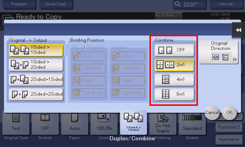 Wählen Sie unter [Kombinieren] die Anzahl der Seiten aus, die auf eine Seite eines Blatt Papiers kopiert werden sollen.