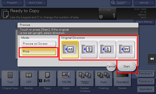 Wählen Sie die Option entsprechend der aktuellen Ausrichtung von Papier und Original aus und tippen Sie dann auf [OK].