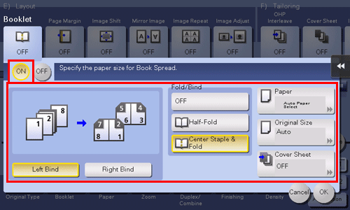 Die eingelegten Originalseiten werden automatisch in einer für die Mittelbindung passenden Reihenfolge angeordnet und die 2-auf-1-Funktion wird aktiviert, um auf beide Blattseiten zu kopieren.