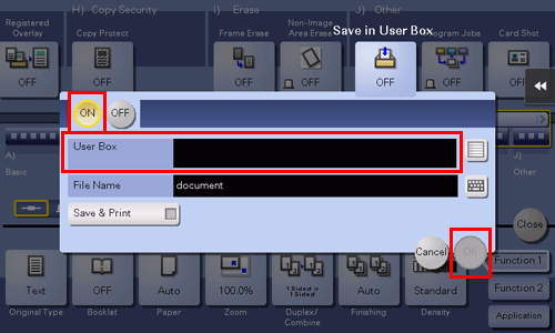Tippen Sie auf [EIN], wählen Sie in Box eine [Box] zum Speichern aus und tippen Sie dann auf [OK].