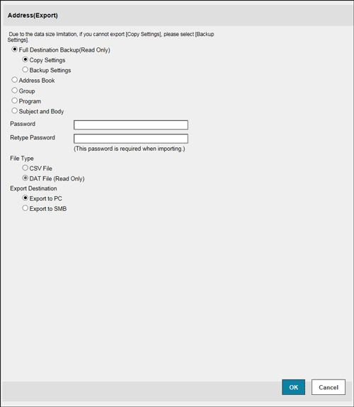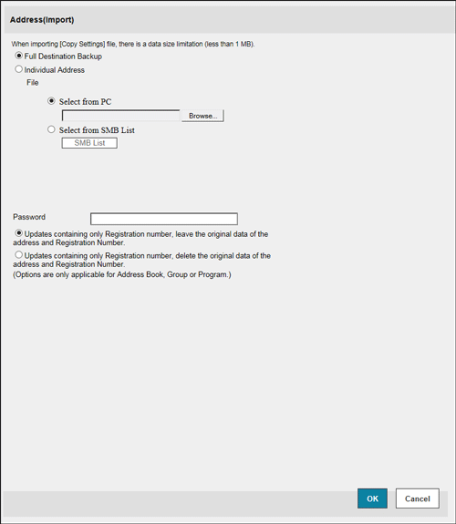 Wenn der Export mit Kennworteingabe durchgeführt wurde, ist für den Import der Ziele auf ein anderes MFP auch die Kennworteingabe erforderlich.