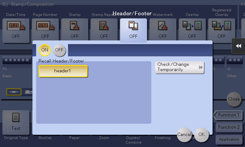 [Compr./Cambiar temporalmente] | Si es necesario, compruebe o cambie temporalmente el contenido del encabezado/pie registrado.