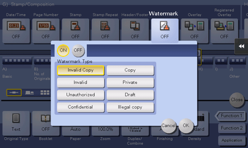 Es posible que se pierda parte de la marca de agua según el tamaño del papel, tal como en el caso de A6 y B6. De ser así, la máquina cancela automáticamente la función de marca de agua para la copia.