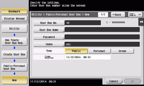 Toque [Utilidad] - [Registro destino/carpeta] - [Registro carpeta] - [Carpeta usuario público/personal] - [Nueva].