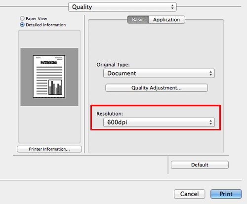 Sous [Resolution:] de l'onglet [Quality], sélectionnez la résolution pour imprimer un document.