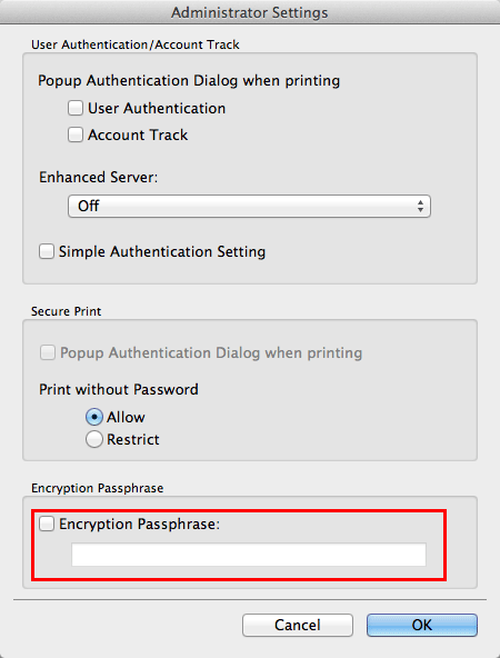 Cochez la case [Encryption Passphrase:] et entrez la phrase-code de cryptage (avec 20 caractères alphanumériques max., symboles compris) que vous avez définie sur cette machine.
