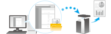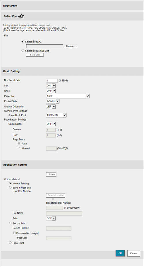 La fonction Impression directe vous permet d'envoyer directement des fichiers PDF (Ver.1.6), JPEG, TIFF, XPS, PS, PCL, Texte, OOXML (.docx/.xlsx/.pptx) et PPML (.ppml/.vdx/.zip) de votre ordinateur ou d'un dossier de partage SMB à cette machine pour les imprimer sans utiliser le pilote d'imprimante.
