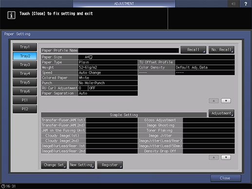 You can output test charts depending on the work status by arbitrarily setting paper conditions for each paper tray.