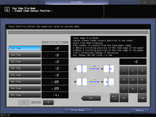 (-) To move the crease position to the lead edge, (+) To move the crease position to the rear edge