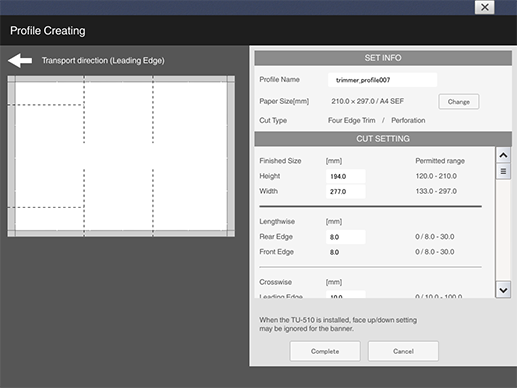 Set a trimmer profile for [Four Edge Trim / Perforation]. You can set the finishing size and perforation position.