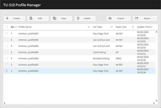 The exported trimmer file is saved on this system, and it can be recalled using [Import].