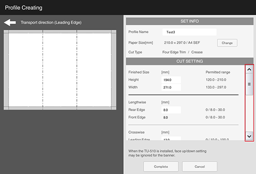 4 | [1x1-3x3 Cutting(CR)] | Set trim and crease positions. | Widthwise 140.0 mm to 330.2 mm, lengthwise 143.0 mm to 1,300.0 mm / Widthwise 5.51" to 13", lengthwise 5.63" to 51.18" | Widthwise 85.0 mm / 3.35" or higher, lengthwise 133.0 mm / 5.24" or higher | 128 g/m2 to 300 g/m2 / 34 lb Bond to 81 lb Bond (Coated paper: 157 g/m2 to 300 g/m2 / 42 lb Bond to 81 lb Bond) | Secondary (sub) tray of Trimmer Unit TU-510 |