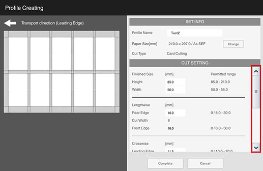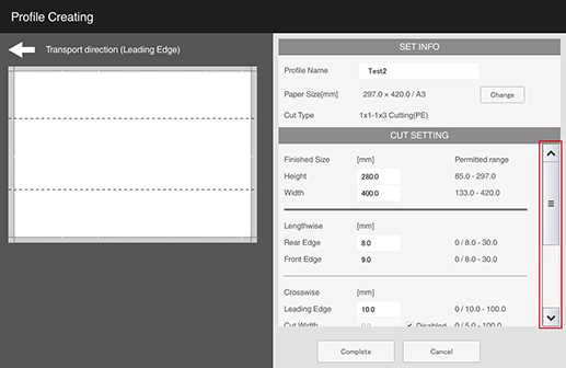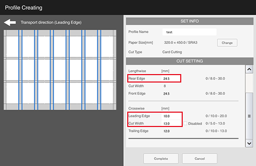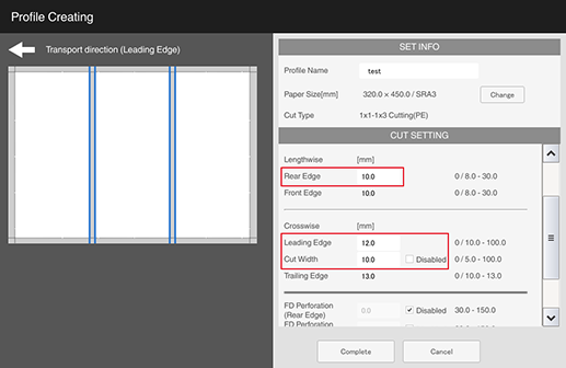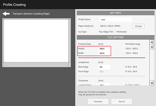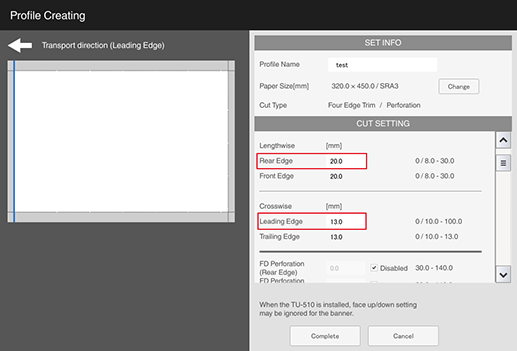 S1 | [Lengthwise] - [Rear Edge] (amount of top edge to be cut) | 0 mm / 0" (None) or 8.0 mm to 30.0 mm / 0.31" to 1.18" Set the difference between [Rear Edge] (amount of top edge to be cut) and [Front Edge] (amount of bottom edge to be cut) within 10.0 mm / 0.39". Cutting only [Rear Edge] (amount of top edge to be cut) or only [Front Edge] (amount of bottom edge to be cut) is not possible. |