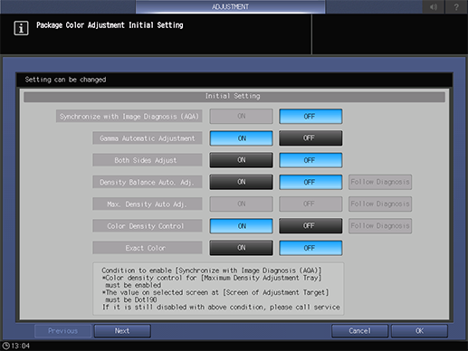 With [Synchronize with Image Diagnosis (AQA)], you can select the items for adjustment to be performed when performing [Package Color Auto Adj.] and the items for adjustment to be performed automatically after [Image Diagnosis]. For details, refer to [Initial Set.].