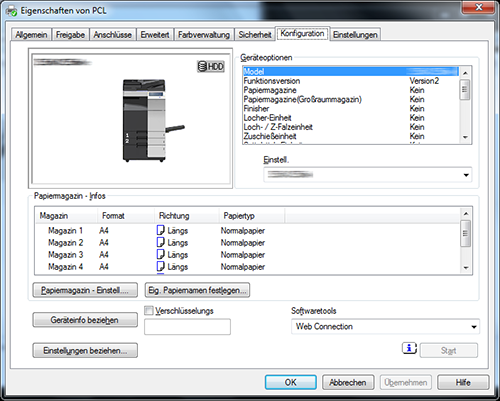 Geben Sie auf der Registerkarte [Konfiguration] die Informationen zum installierten Systemzubehör und zu den eingerichteten Authentifizierungseinstellungen an.