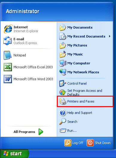 In Windows XP/Server 2003 klicken Sie auf das Startmenü und wählen Sie [Drucker und Faxgeräte] aus.